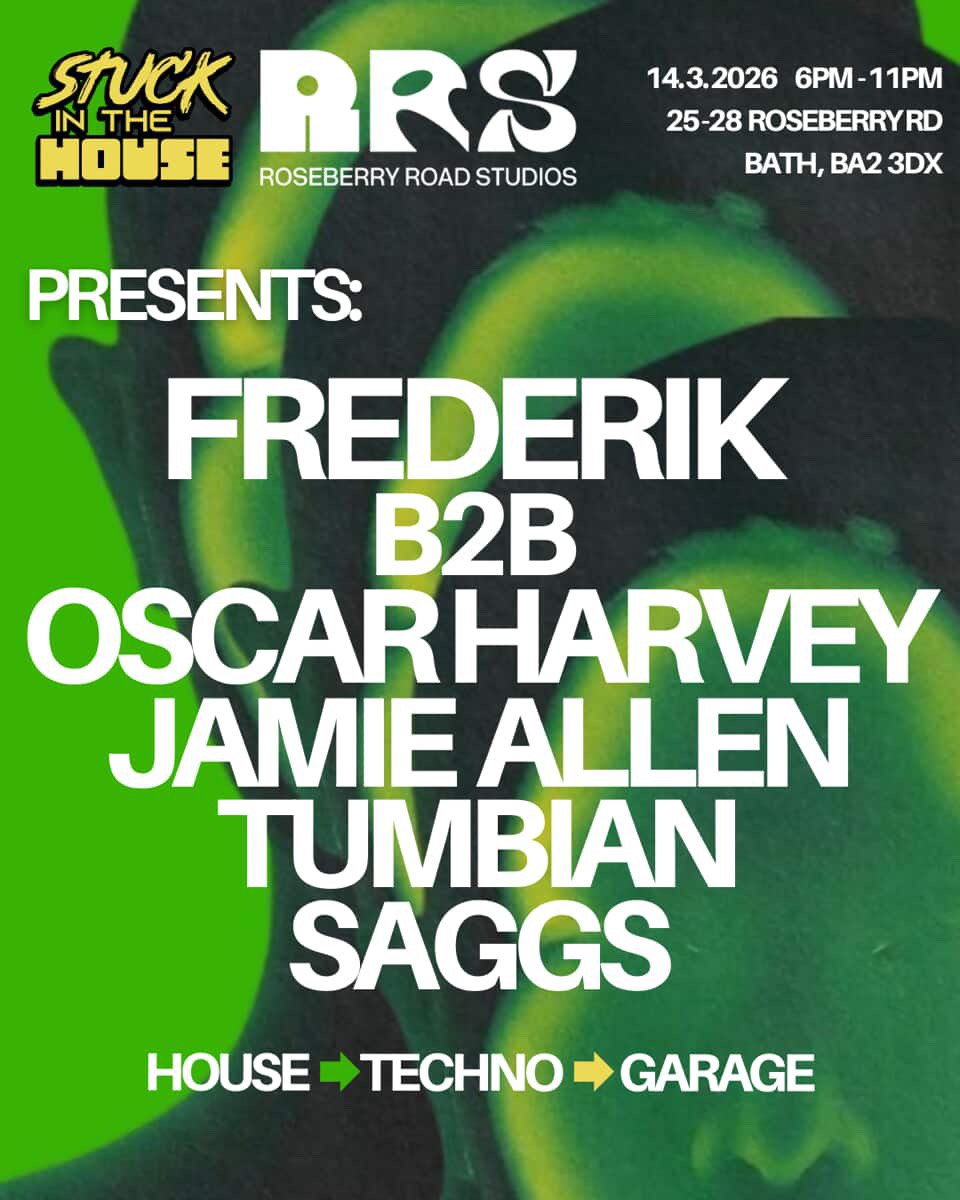 Stuck In The House returns to Roseberry Road Studios, bringing fresh energy and a strong DJ line-up. Headlining is Frederik Gibbons, delivering his signature house and techno sound. Support comes from Oscar Harvey, Jamie Allen, and Tumbian, the Bath-based duo behind Roseberry’s own house night, Leap & Dance, and Saggs…